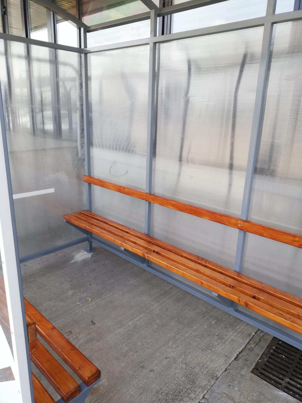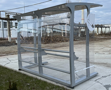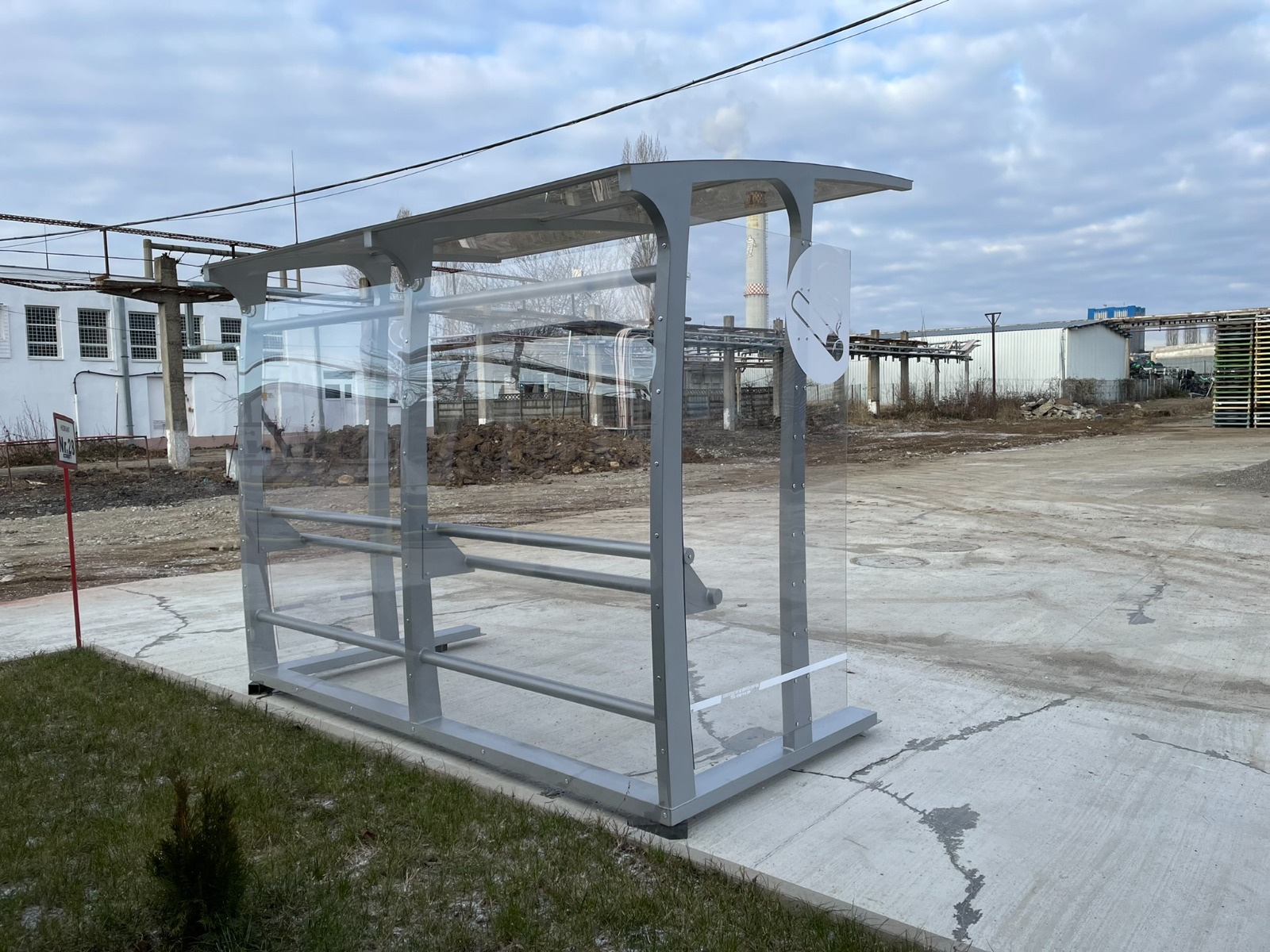 acoperisul placat cu tabla profilata sau policarbonat, pereti din sticla securizata sau policarbonat. Optional pot fi adaugate bancute precum si cosuri de gunoi si scrumat.